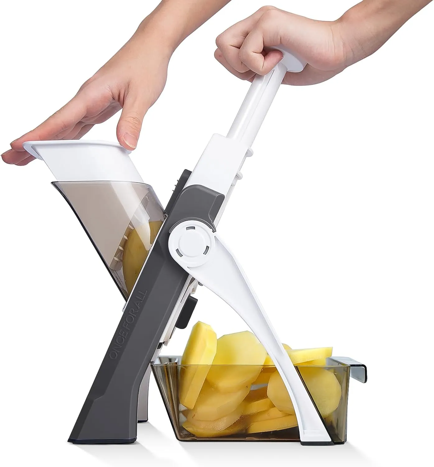 Upgrade your kitchen with the Multifunction Spring Slicer 5-in-1 Vegetable & Fruit Cutter—your all-in-one solution for fast, precise, and effortless meal prep. Designed with a Mandoline-style cutting system, this slicer offers more than 40 adjustable thickness settings, giving you complete control for perfect slices every time. Whether you're prepping cucumbers, carrots, potatoes, fruits, or making ultra-thin chips, this manual hand slicer delivers clean, uniform cuts safely and efficiently.